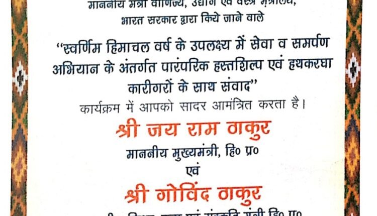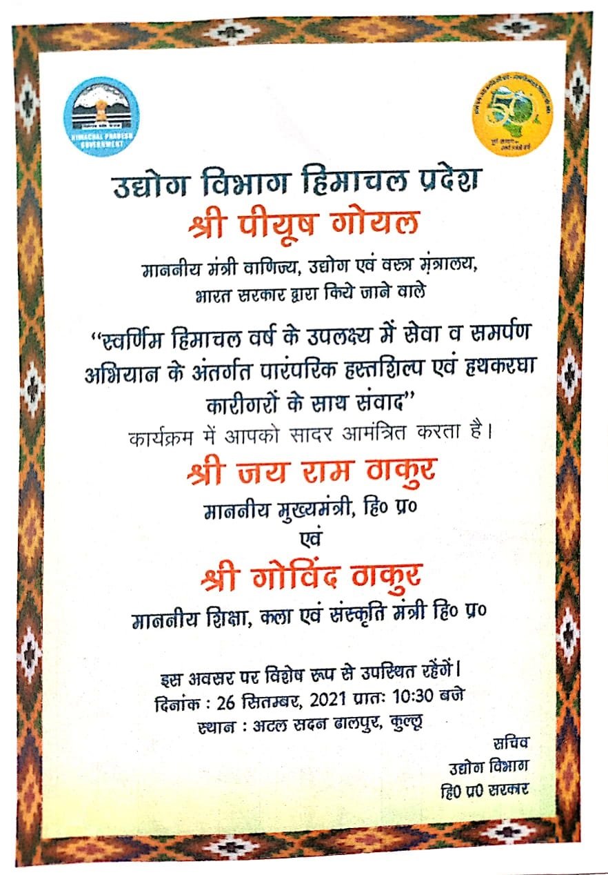 कुल्लू। केन्द्रीय वाणिज्य एवं उद्योग मंत्री पीयूष गोयल 26 सितम्बर को प्रातः 10.30 बजे अटल सदन ढालपुर मैदान में स्वर्णिम हिमाचल वर्ष के उपलक्ष्य में सेवा व समर्पण अभियान के अन्तर्गत पारम्परिक हस्तशिल्प एवं हथकरघा कारिगरों के साथ संवाद करेंगे। मुख्यमंत्री श्री जयराम ठाकुर तथा शिक्षा, भाषा, कला एवं संस्कृति मंत्री विशेष रूप से उपस्थित रहेंगे।