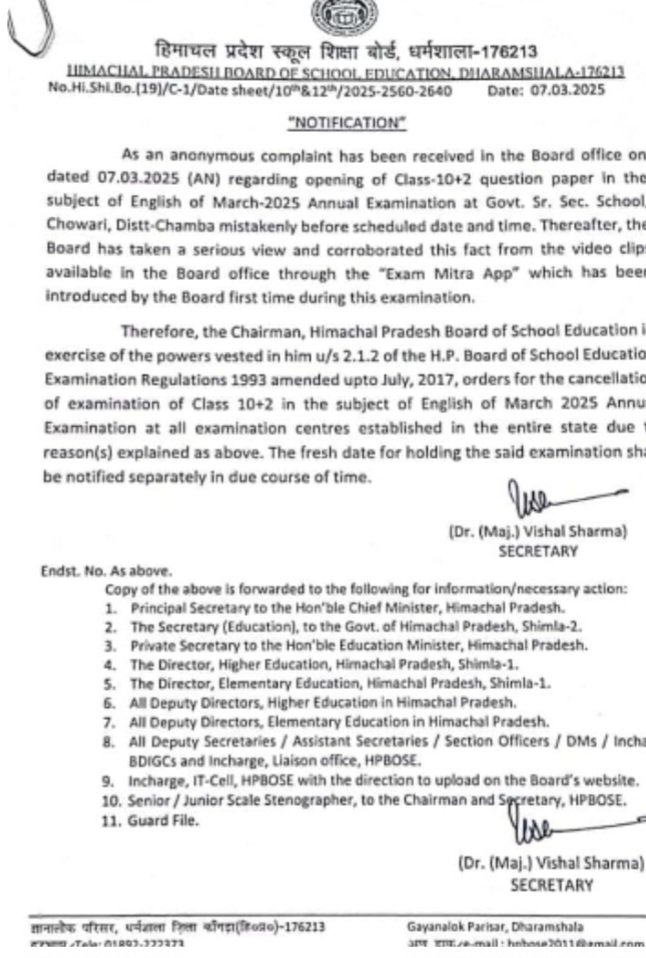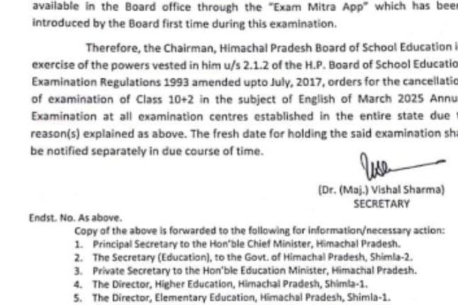 हिमाचल प्रदेशऊनाकांगड़ा हिमाचल प्रदेश स्कूल शिक्षा बोर्ड की जमा दो की इंग्लिश की परीक्षा रद्द धर्मशाला। हिमाचल प्रदेश स्कूल शिक्षा बोर्ड की जमा दो की इंग्लिश की परीक्षा आगामी आदेशों तक स्थगित। इस संदर्भ में अधिसूचना जारी कर दी गई है। By Himachal Grameen Last updated Mar 7, 2025 Share Post Views: 239 Share FacebookTwitterGoogle+ReddItWhatsAppPinterestEmail
