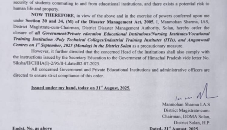 सोलन जिला में पहली सितम्बर को सभी शिक्षण संस्थान रहेंगे बंद