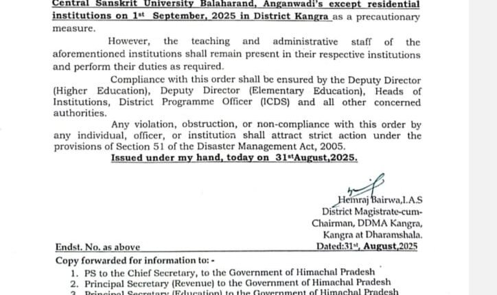 हिमाचल प्रदेशकांगड़ा कांगड़ा जिला में भी सभी शिक्षण संस्थान रहेंगे बन्द By Himachal Grameen On Aug 31, 2025 Share कांगड़ा। कांगड़ा जिले में भी सभी शिक्षण संस्थान रहेंगे बन्द। इस संबंध में कांगड़ा के उपायुक्त हेमराज बैरवा ने आदेश जारी कर दिए हैं। Post Views: 51 Share FacebookTwitterGoogle+ReddItWhatsAppPinterestEmail