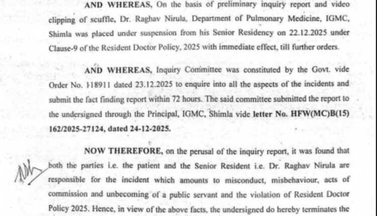 हिमाचल प्रदेशशिमला आईजीएमसी में रोगी के साथ मारपीट मामले में डॉ राघव नरूला को टर्मिनेट किया गया ….आदेश जारी By Himachal Grameen On Dec 24, 2025 Share शिमला Post Views: 24 Share FacebookTwitterGoogle+ReddItWhatsAppPinterestEmail