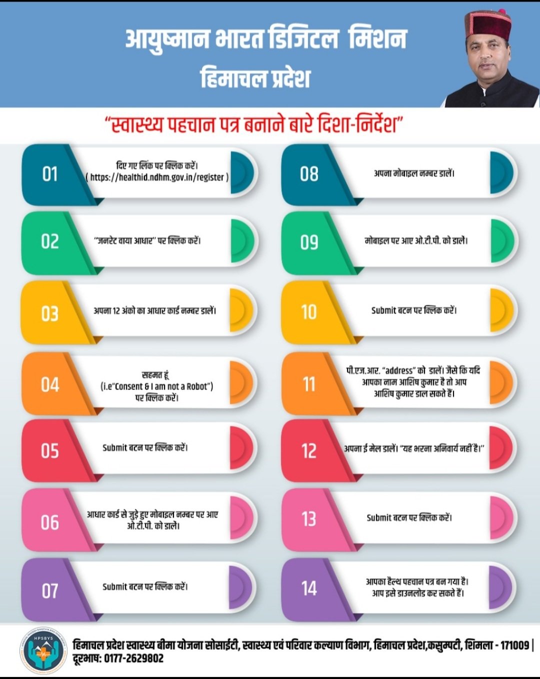 मुख्य चिकित्सा अधिकारी ने कहा कि आयुष्मान भारत डिजिटल मिशन के अन्तर्गत यूनिक हेल्थ आईडी कार्ड बनाए जा रहे हैं। इसके लिए लाभार्थी 31 मार्च 2022 तक वैबसाईट  https://healthid.ndhm.gov.in  पर विजिट कर हेल्थ आईडी बना सकते हैं।